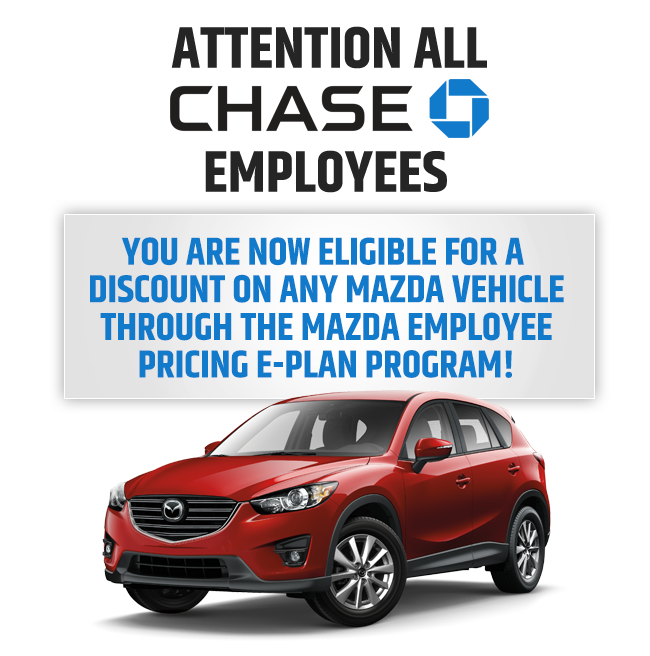 Employees of JPMorgan Chase are now eligible, through the Mazda Employee Pricing E-plan Program, to purchase or lease a new Mazda vehicle at 4% off dealer invoice.