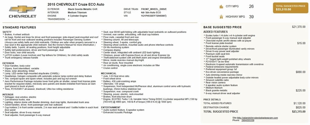 1 Owner / Local Trade in, Cruze ECO, 6-Speed Automatic Electronic with Overdrive, Alloy wheels, Auto-Dimming Inside Rear-View Mirror, Driver 6-Way Power Seat Adjuster, Driver/Front Passenger Illuminated Vanity Mirrors, ECO Driver Convenience Package, Fully automatic headlights, Outside Heated Power-Adjustable Body-Color Mirrors, Preferred Equipment Group 1SF, Premium Cloth Seat Trim, Rear Vision Camera, Remote Vehicle Starter System.
