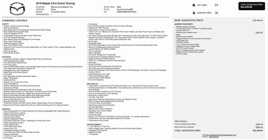 1 Owner / Local Trade in, CX-5 Grand Touring, AWD, 19 x 7J Aluminum Alloy Wheels, Auto High-beam Headlights, Exterior Parking Camera Rear, Heated front seats, Leather Seat Trim, Memory seat, Power driver seat, Power Liftgate, Power moonroof, Rain sensing wipers.