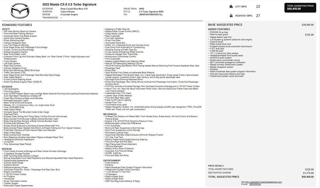 Powered by a robust 2.5L Turbo I4 engine and paired with a 6-Speed Automatic transmission, this all-wheel-drive CX-5 delivers an exhilarating and efficient driving experience. With an EPA-estimated 22 MPG in the city and 27 MPG on the highway, you'll enjoy the perfect balance of performance and fuel economy.