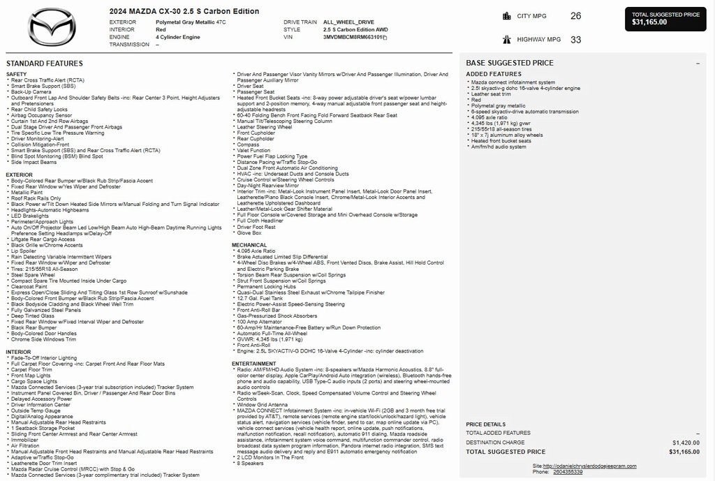 1 Owner, Certified Pre Owned, CX-30 2.5 S Carbon Edition, AWD, AppLink/Apple CarPlay and Android Auto, Auto High-beam Headlights, Exterior Parking Camera Rear, Heated front seats, Leather Seat Trim, Memory seat, Power driver seat, Power moonroof, Rain sensing wipers, Wheels: 18" x 7J Aluminum Alloy.
