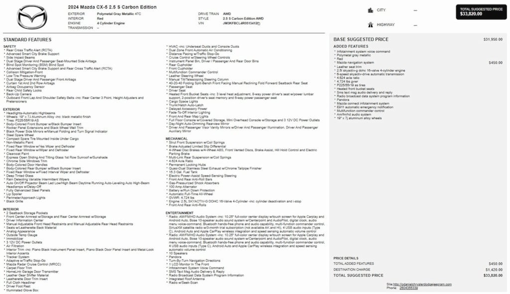 1 Owner, Certified Pre Owned, CX-5 2.5 S Carbon Edition, AWD, AppLink/Apple CarPlay and Android Auto, Auto High-beam Headlights, Exterior Parking Camera Rear, Heated front seats, Leather Seat Trim, Memory seat, Power driver seat, Power Liftgate, Power moonroof, Rain sensing wipers, Wheels: 19" x 7J Aluminum Alloy.