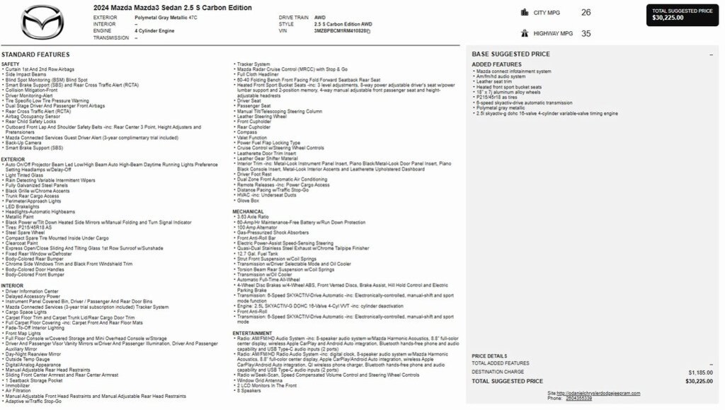 1 Owner, Certified Pre Owned, Mazda3 2.5 S Carbon Edition, AWD, Auto High-beam Headlights, Exterior Parking Camera Rear, Heated Front Sport Bucket Seats, Leather Seat Trim, Memory seat, Power driver seat, Power moonroof, Rain sensing wipers, Wheels: 18" x 7J Aluminum Alloy.