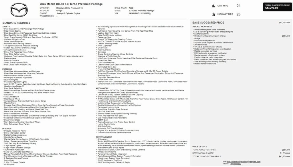 Apple CarPlay / Android Auto, 1 Owner / Local Trade in, Certified Pre Owned, CX-90 3.3 Turbo Preferred, I6 Turbo, AWD, Auto High-beam Headlights, Automatic temperature control, Exterior Parking Camera Rear, Heated Front Bucket Seats, Leather Seat Trim, Power driver seat, Power Liftgate, Power moonroof, Rain sensing wipers, Wheels: 19" x 8.5J Aluminum Alloy.