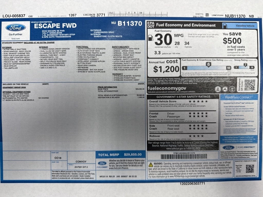 Extra Clean!, Escape SE, 4D Sport Utility, 1.5L EcoBoost, 8-Speed Automatic, FWD, Carbonized Gray Metallic, Sandstone Cloth, Equipment Group 200A.